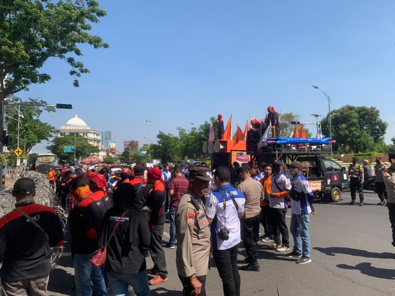 Redaksi.news, Surabaya – Dewan Pimpinan Wilayah Federasi Serikat Pekerja Metal Indonesia Jawa Timur (DPW FSPMI JATIM) melakukan aksi unjuk rasa di depan kantor Gubernur, Provinsi Jatim, Jl. Pahlawan No. 110 Kota Surabaya, pada Senin (8/7/2024).