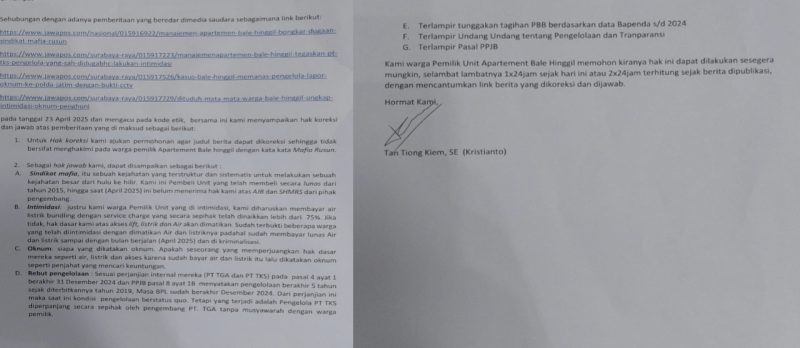 Dalam suratnya, ia menyatakan keberatan atas penyebutan dirinya sebagai “Diduga Mafia Rusun”. Padahal, dalam berita yang dimaksud, istilah tersebut disampaikan dengan menggunakan kata “diduga”, sebagai bentuk praduga yang sah secara jurnalistik dan bukan bentuk penghakiman.