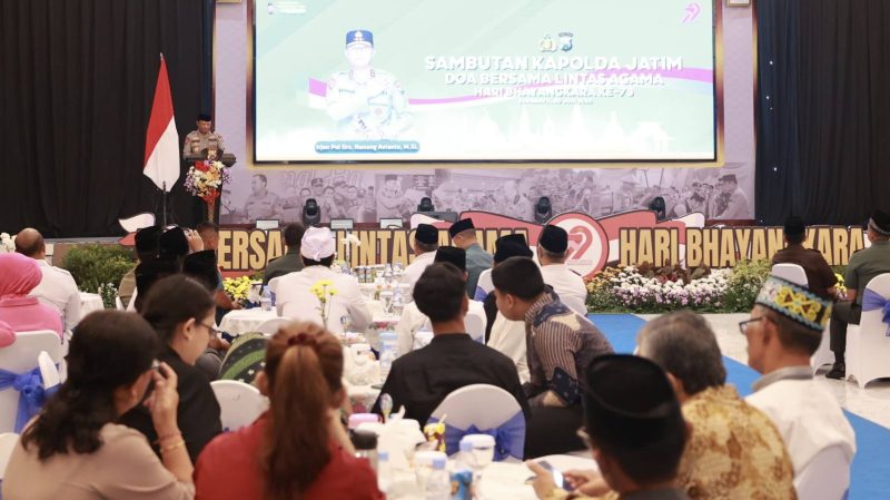 Redaksijatim.id, Surabaya – Kepolisian Daerah Jawa Timur menggelar doa bersama lintas agama dalam rangka menyambut Hari Bhayangkara Ke-79 tahun 2025 di Gedung Mahameru Polda Jatim, Senin (30/6/2025). Acara yang sarat makna toleransi ini dihadiri berbagai unsur pimpinan daerah dan tokoh masyarakat.